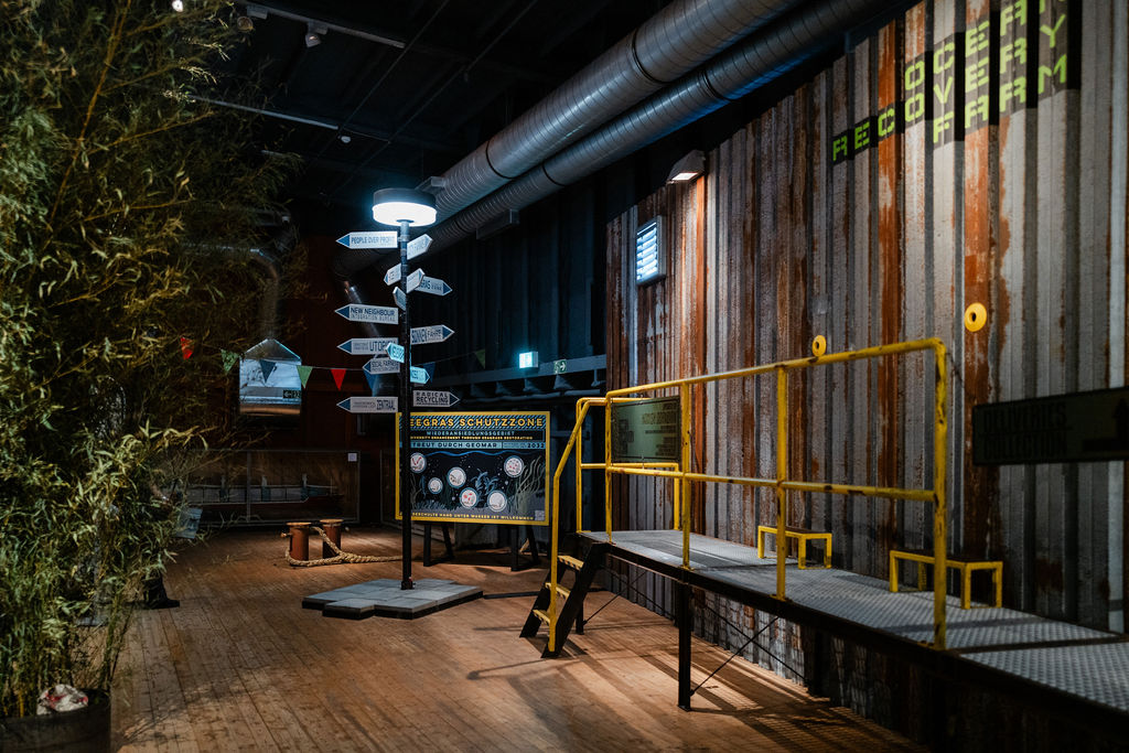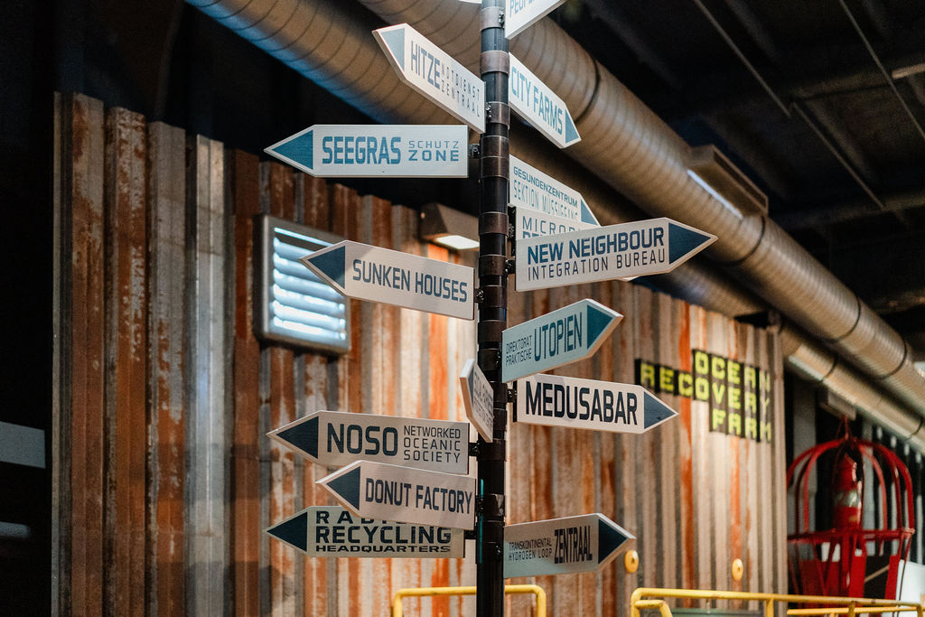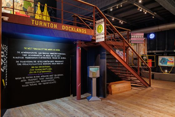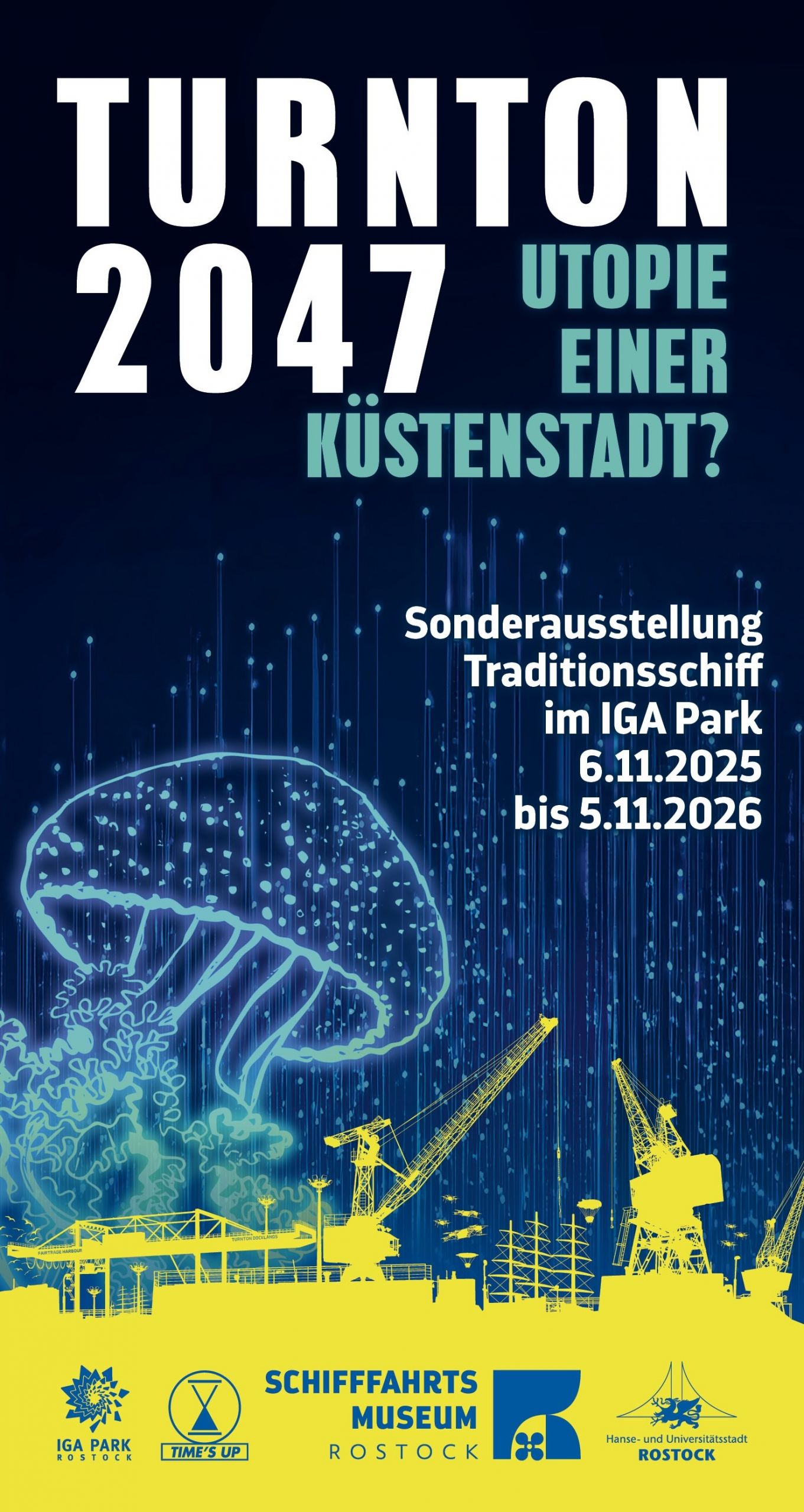 Das Künstler*innenkollektiv Time’s Up aus Linz hat gemeinsam mit renommierten Forschungseinrichtungen wie dem Leibniz-Institut für Ostseeforschung Warnemünde (IOW), dem GEOMAR Helmholtz-Zentrum für Ozeanforschung Kiel und dem Institut für Ostseefischerei Rostock ein begehbares Zukunftsszenario entwickelt. Im Mittelpunkt steht die fiktive Stadt Turnton – ein Ort, der zeigt, wie sich Leben und Umwelt unter dem Einfluss des Klimawandels verändern könnten.